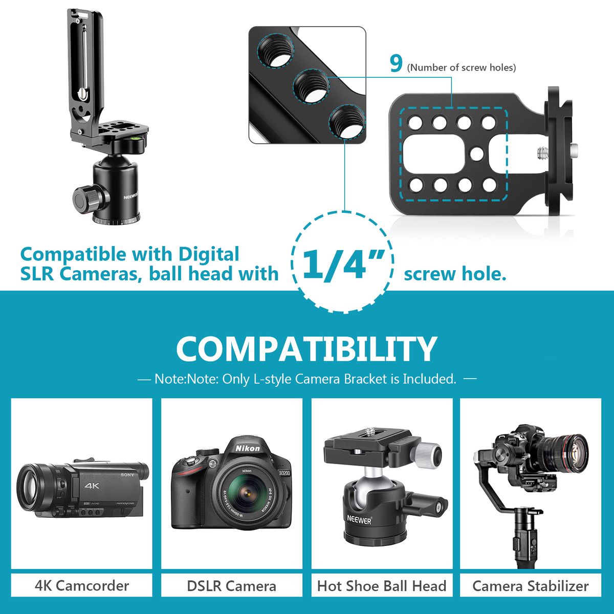 COMPATIBILITY: There is a short Arca-Swiss standard screw-knob QR plate and a long L-shaped QR plate compatible with most of DSLR cameras with Arca-Swiss standard. With 1/4 screw, it can be used with camera models Nikon D7500/D800/D810/D750/D850/D700/D7000/D7100/D7200/D90/D3400/3300/5600/5300 Canon 450D/700D/750D/5D2/5D3/5D4/600D/70D/80D/800D Sony a9/a7iii/a7riiii//a7ii/a7rii/A7Sii/a6000/6300/6500 etc.