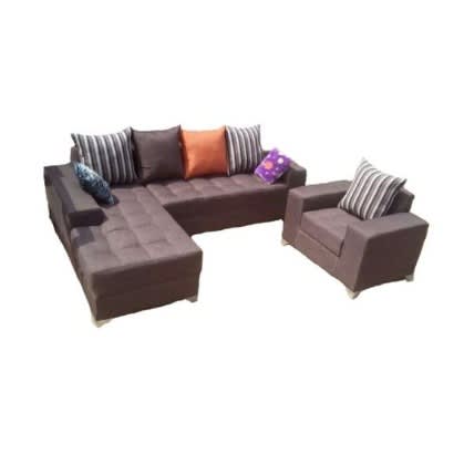 - Set of L-shaped sofa couch and additional single seater chair with free throw pillows. Brown colour fabric materials. Set of 6 seater couches with single. Quality woods and high density foams with fibres