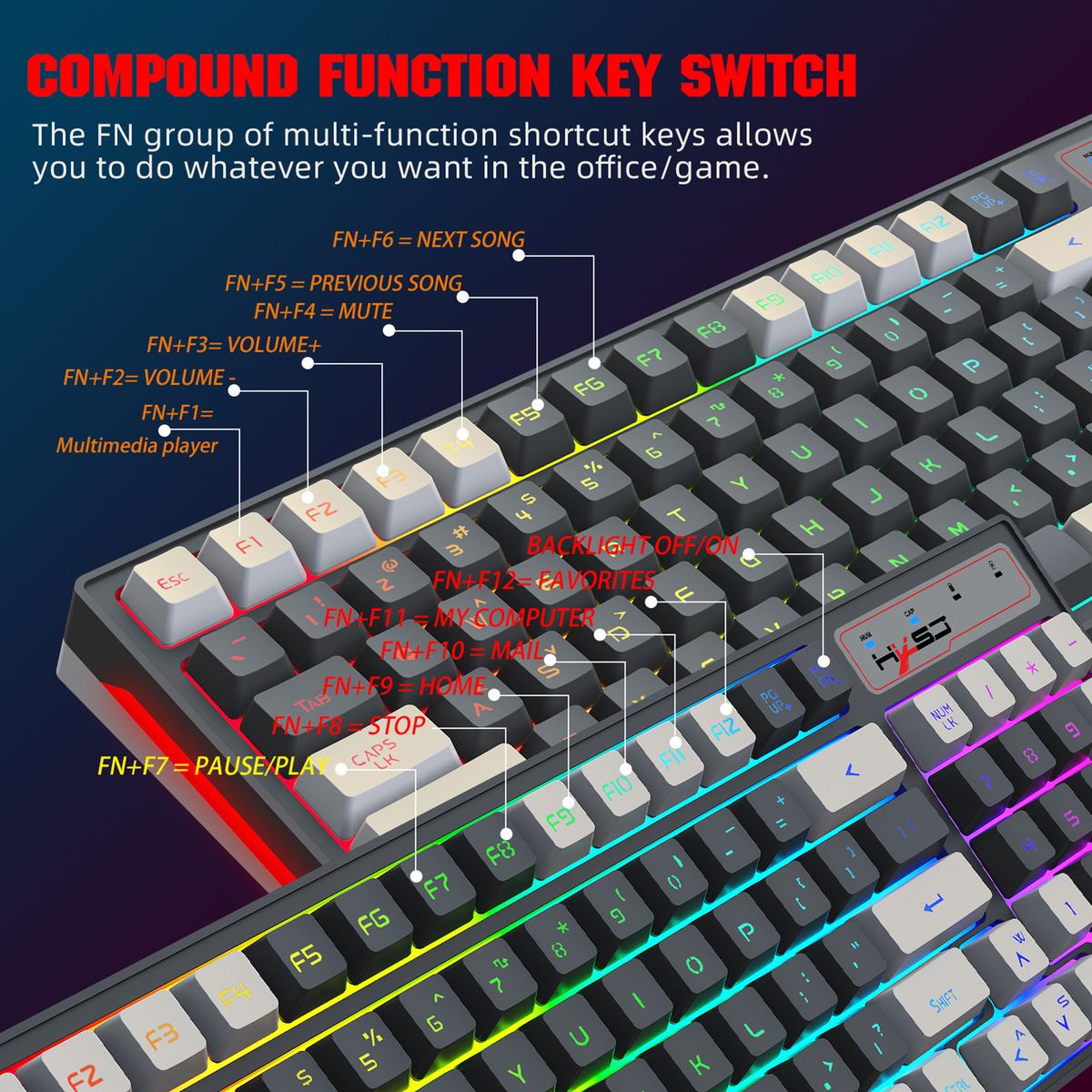 - The FN group of multi-function shortcut keys allow you to do whatever you want in office work/game.