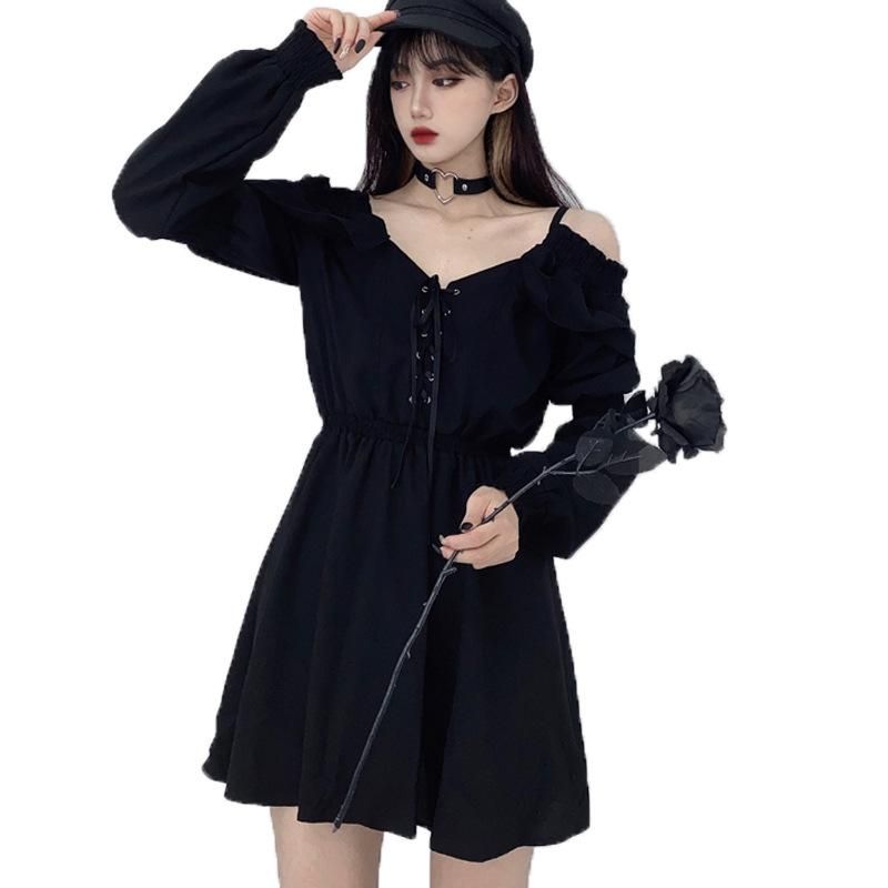 Buy Lace up dress ins dark black lace up suspender off the shoulder waist shows thin Hepburn style small in Nigeria