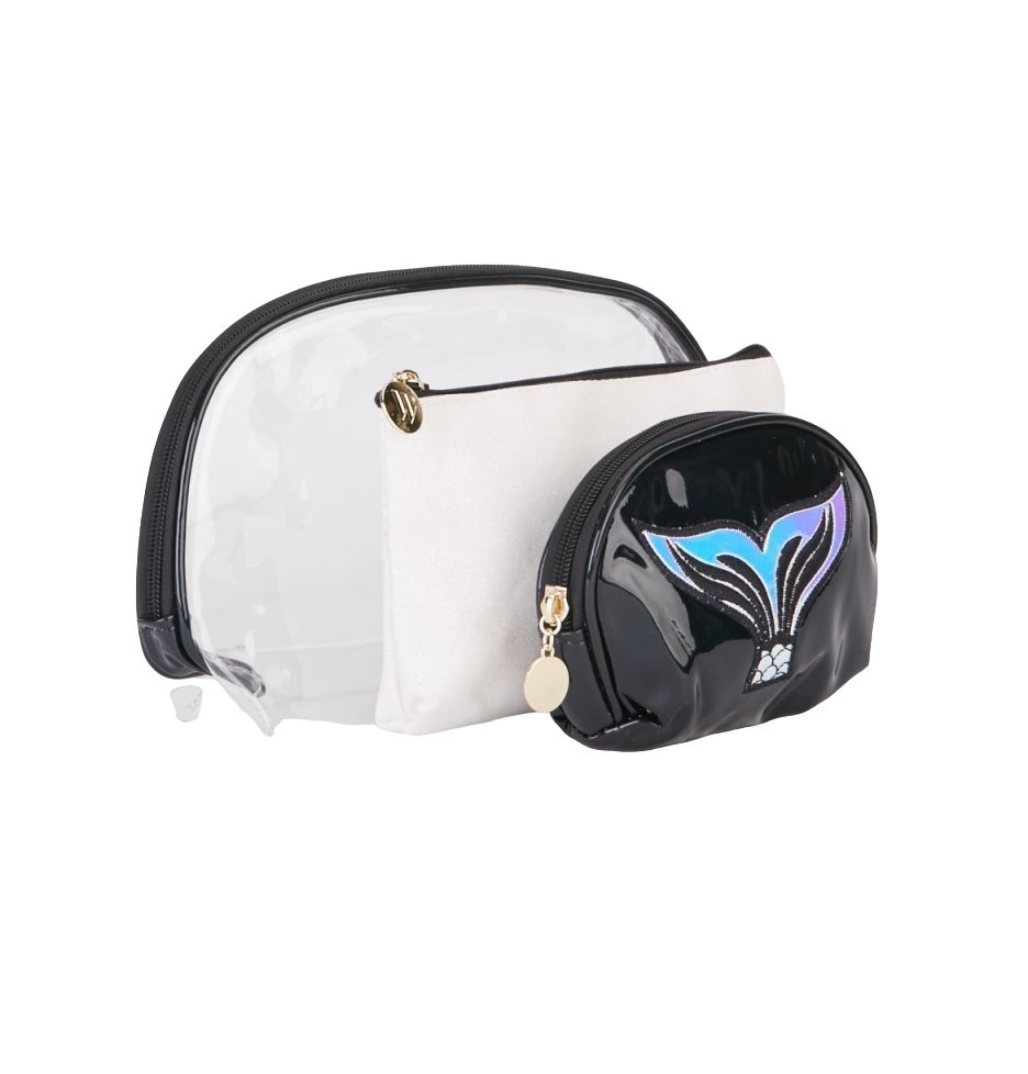 toiletry makeup essentials Bag Set. It contains three bags of different sizes:1. Transparent bag: 10 inches x 6 inches x 3 inches2. White glitter bag: 8 inches x 5 inches x 0.5 inches 3. Black purse with mermaid tail detail: 6 inches x 4 inches x 1.5 inches