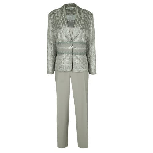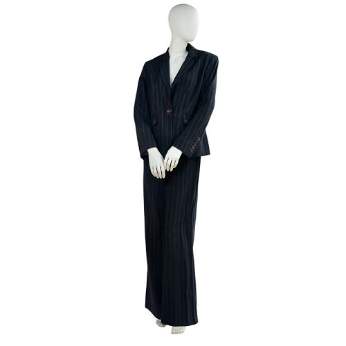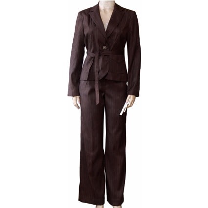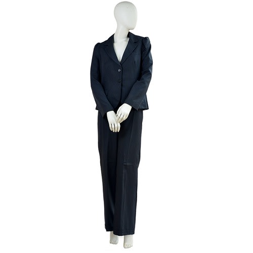 Fully lined blazer and features a notched collar, matching belted waist, panel structure, and long sleeves with front button closure. The matching pants feature structured waist inset pockets, hook-and-bar and zipper closure, slashes hip pockets, and belt loops.