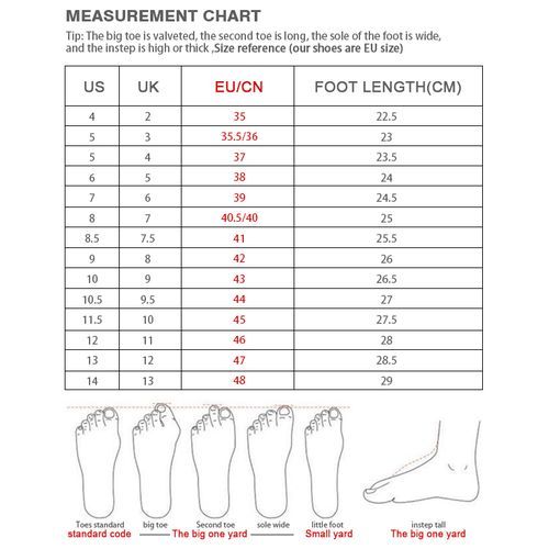 Tip: These shoes are standard European size, please choose your size according to this shoe size chart, thank you!