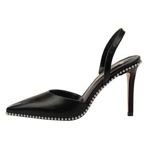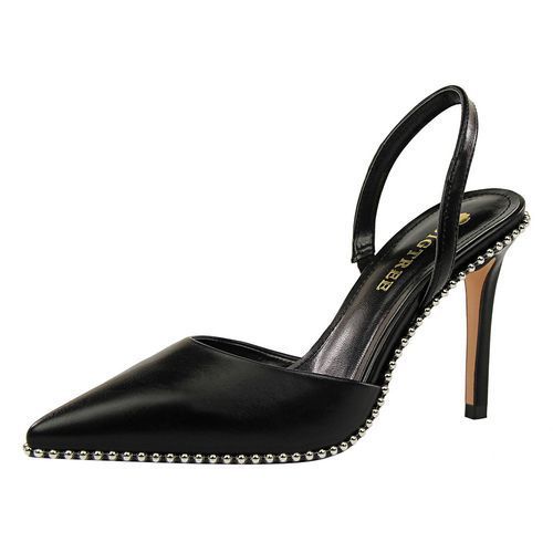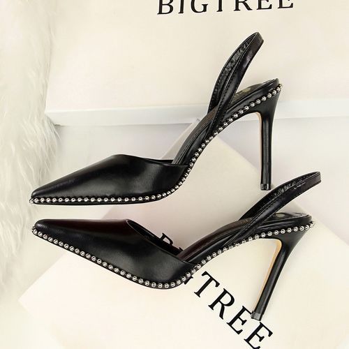 Popular elements: European and American style, fashion, rock style, metal rivet rim, metal bead, back hollow, trip band, pointed Baotou drag, nightclub, high heels