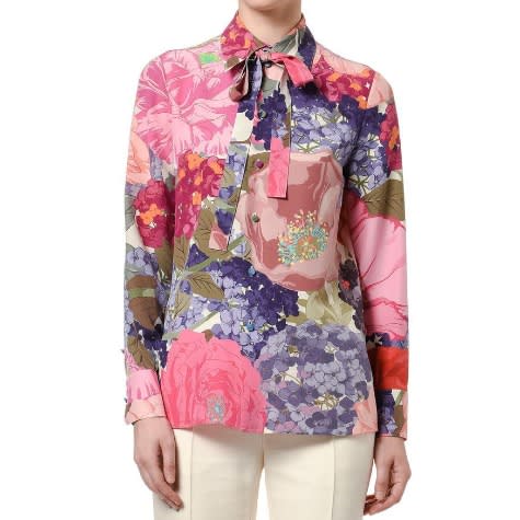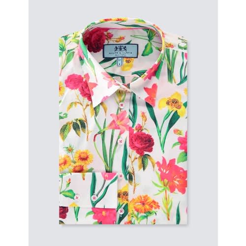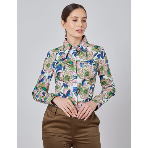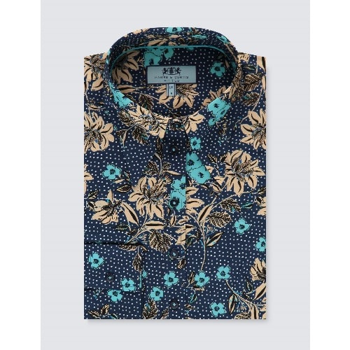 Beautifully crafted from 100% cotton, this women's stylish blue and yellow floral print shirt is designed with single cuffs. This medium fitting shirt is closely cut at the bust and gently expands at the waist and hip, creating a streamlined silhouette.