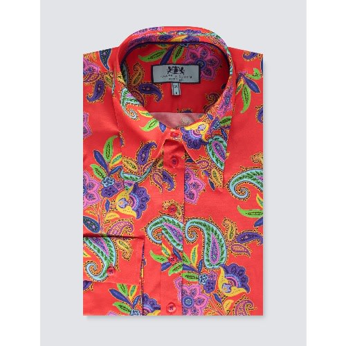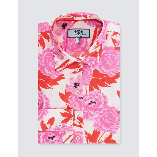 This women's stylish navy and fuchsia shirt features paisley design. It is crafted from high quality cotton and it is designed with an elegant pointed collar and single cuffs. Our fitted shirts have been flatteringly designed with darts at the waist and bust, creating a streamlined silhouette.