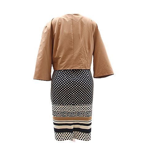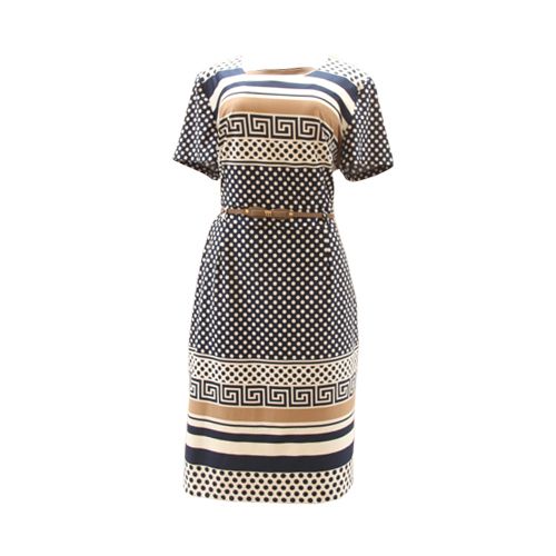 The Jacket is three quarter sleeved with a beautiful rosette. The dress has a short sleeve and a belt to match at the waist. The material is beautifully patterned as it has polka dots, straight and geometric designs. It can be worn with or without the jacket.