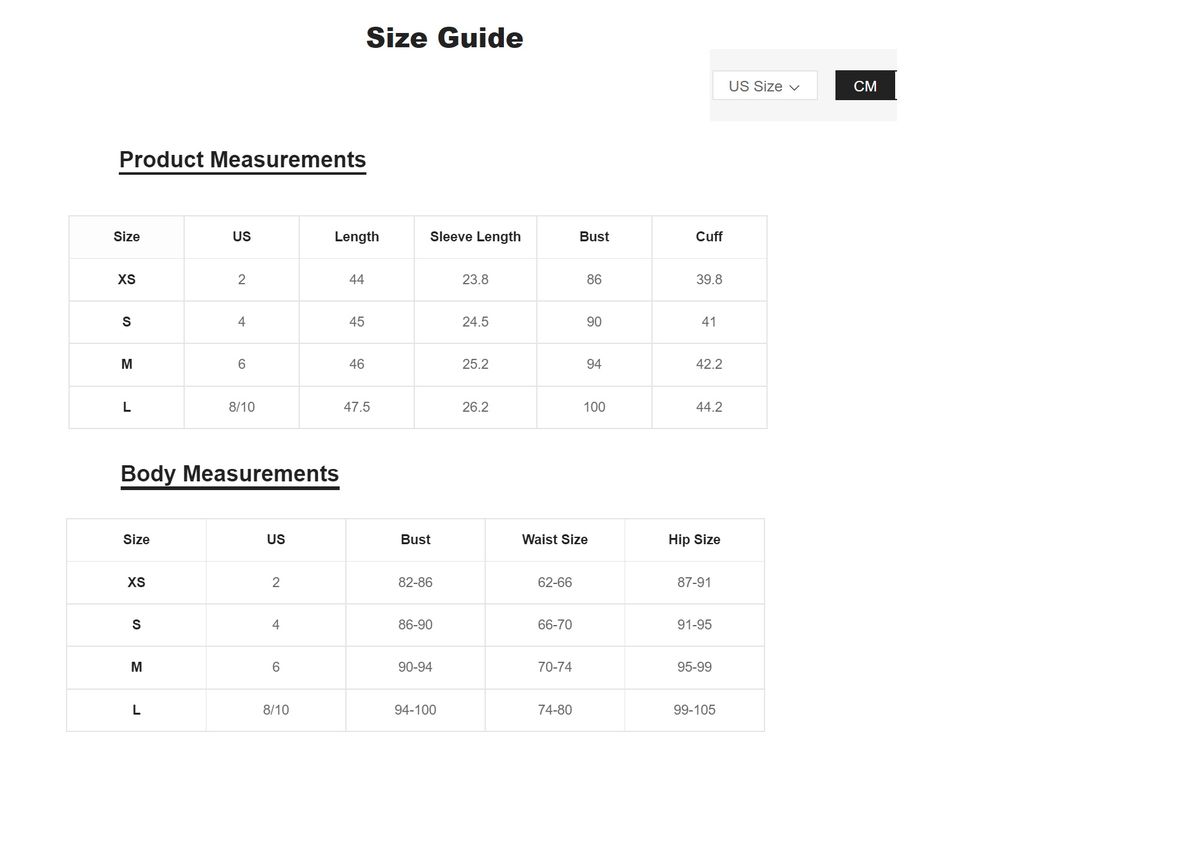 Length44 cm, Sleeve Length23.8 cm, Bust86 cm, Cuff39.8 cm |