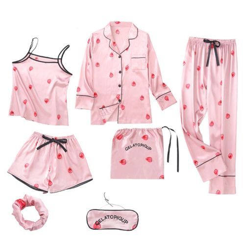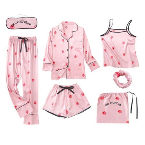 included: a cami, a shirt, a pair of shorts, a pair of pants, a hair tie, a hair band, a storage bag, and eye mask