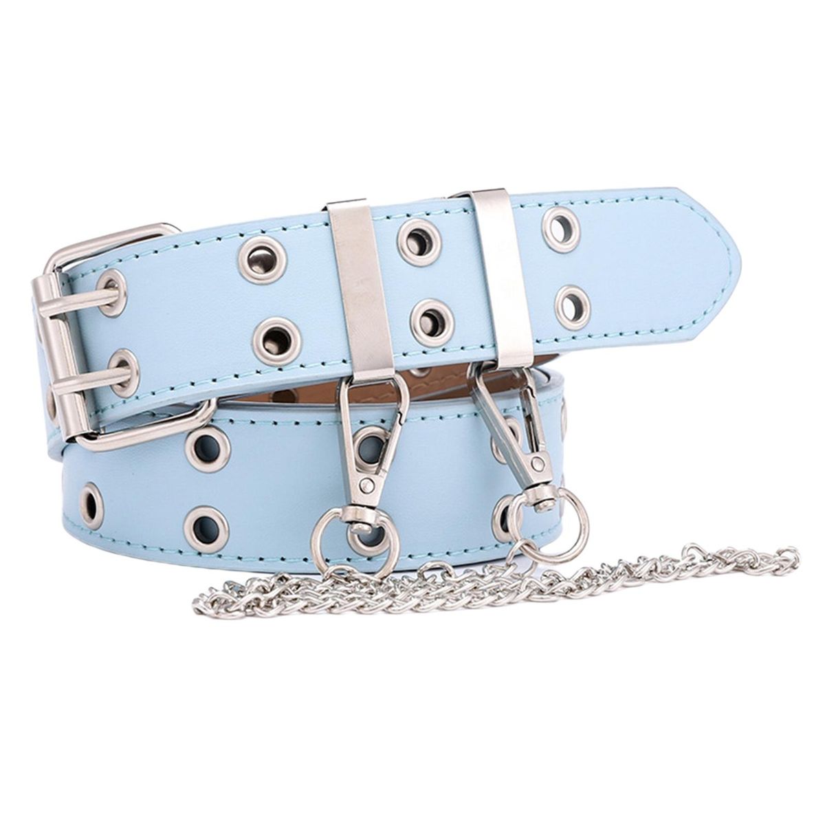 Double grommets belt, vintage punk style, made of high quality PU leather, metal buckle.Unique Design: Metal holes double grommet belt, great for rocker costume, jeans, pants, dresses.Double-prong buckle belt for easy adjustment. Silver metal buckle compliments this belts style.One size fits most. Length: 110cm/43.3inch; Width: 3.3cm/1.3inch. Double grommets cover the whole belt, can be adjusted for different waist sizes.Women leather garter waist belt, perfect for the dating, party, cosplay, , bar, skateboarding, dancing or masquerade costumes.