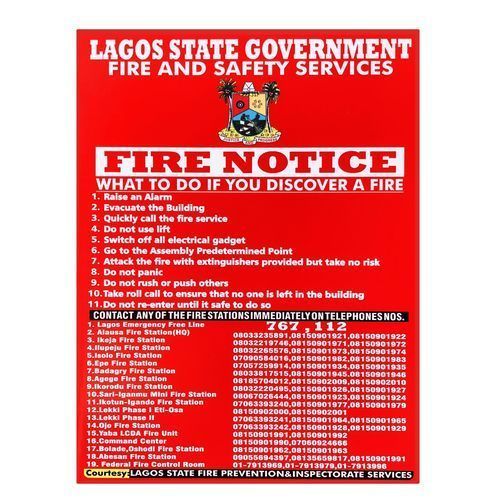 The Lagos State Fire Notice Signage contains the contacts of all fire service contacts in Lagos state safety. in the event of a fire or incidence anyone can contact the nearest fire service station with the contacts listed on the notice board.