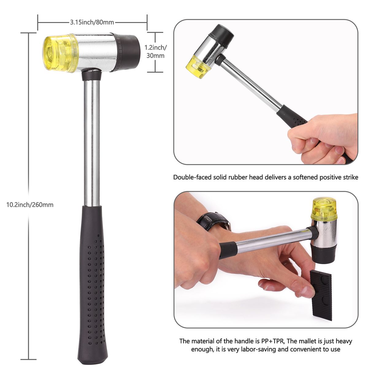 The one side is rubber hammer, another side is solid hammer, the handle forged into the hammer head, which is powerful to use and will not fall off.