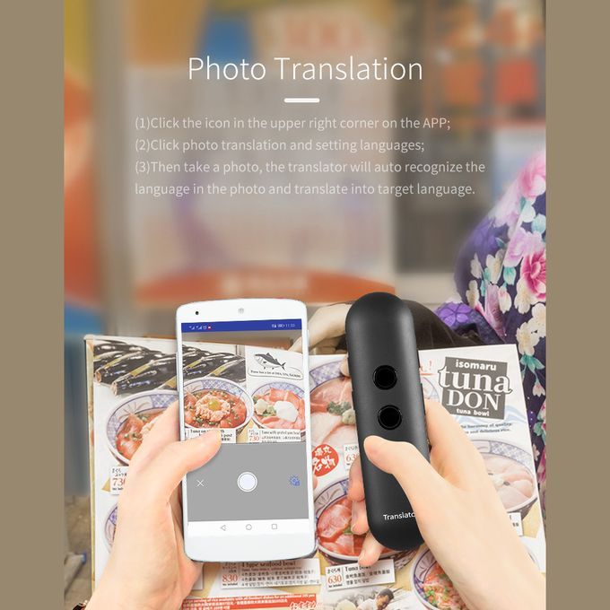 Multifunctional translator. It supports voice input to translate and you can also take a pic or input text of your material using the APP to get the translation.
