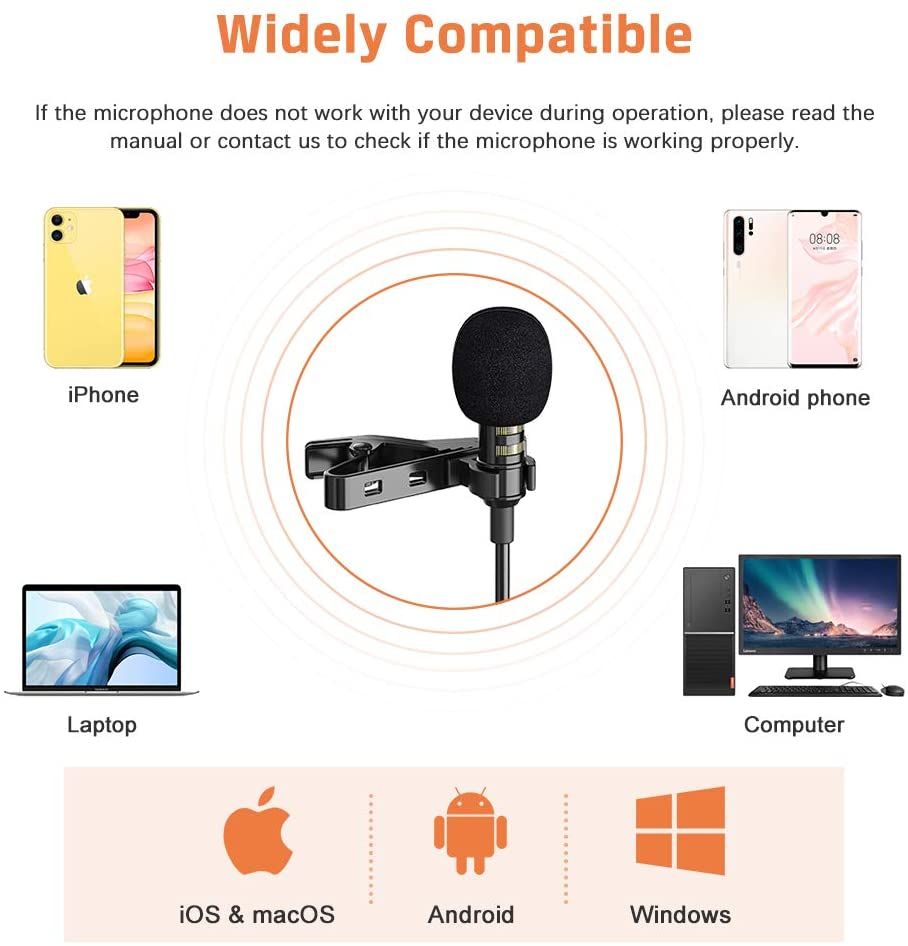 EXTRA-LONG CORD: The 3.5 mm lavalier microphone cord is 16 FEET!!! Perfect in every possible recording scenario. You don't have to worry about short distance for recording sound. Move around freely when doing video recording!!!