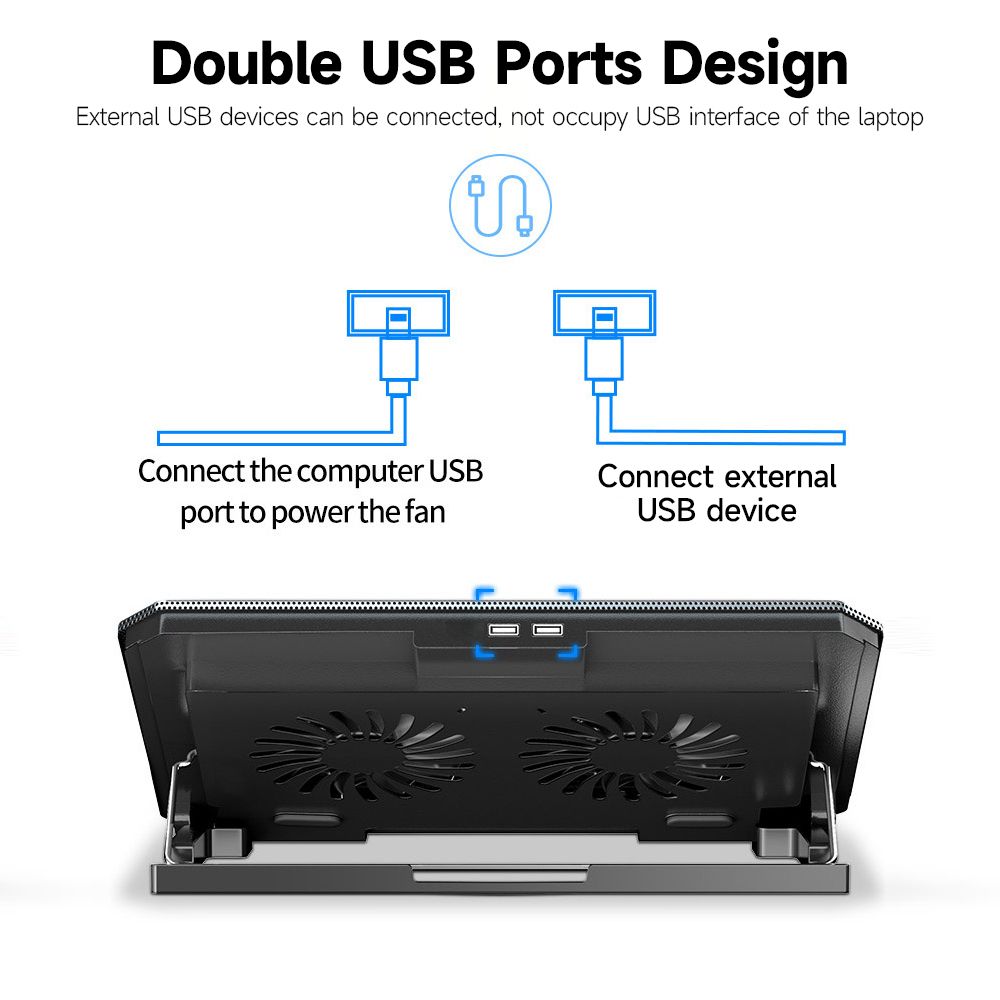 Features:【Dual Efficient Fans 】Laptop cooling fan with two efficient fans,Cooling pad for laptop all of create a noise-free environment for you, sound down to 15 decibels.You won't even hear them!【 Ergonomic Desigh】Laptop fan cooling pad as an ergonomic stand, cooling pad with 4 adjustable height settings to meet different needs when working or playing game, Also equipped with a detachable non-slip baffle, effectively prevent laptop slipping off.【Double USB ports design】External USB devices can be connected, not occupy USB interface of the laptop.【Quality Strong & Durable】The gaming laptop fan cooling pad adopt high-quality directional metal mesh, 1.5mm aperture metal mesh surface, which is firm and not easy to deform. The maximum weight bearing is 40 lb.【Easy To Carry】 Our computer fan for laptops weighs in at a mere 750g making it one of the most lightweight coolers for its size, it is completely flat making it ideal for transport in a backpack or a briefcase.【Quality Strong & Good Gift】 laptop cooling fan for lap is a very good gift for family, friends, and colleagues,sturdy in quality,because cooling laptop pad is sturdy and durable inside and has a beautiful color box on the outside. Just sent it!