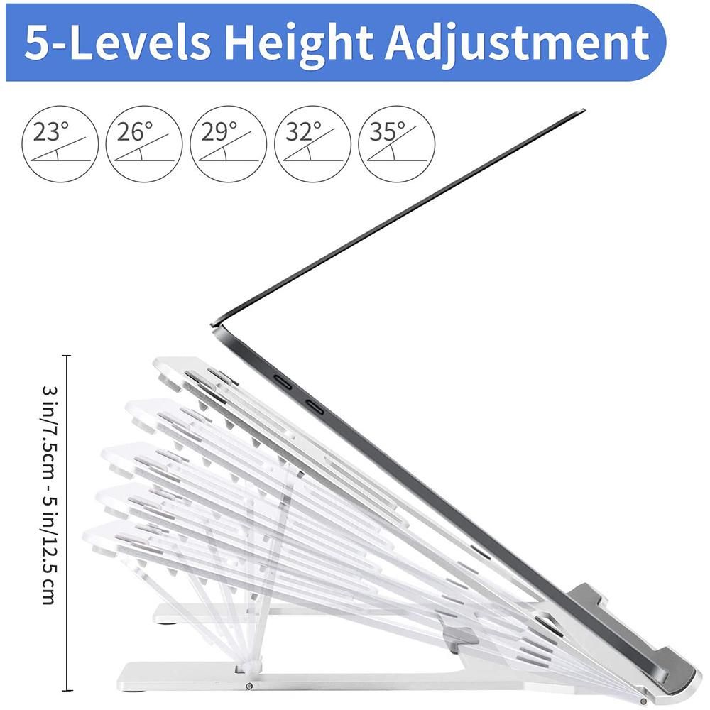 Detailed Information About The Product:5 levels of adjustable height: This laptop stand has 5 levels of adjustable height. You can adjust it to various angles and heights from 7.9 cm to 12.9 cm for easier viewing and typing, finding a comfortable position, and relieving spinal pressure on the neck, back, or waist strain. This is great news for designers, engineers, programmers, office workers, or those who have worked in front of laptops for a long time.