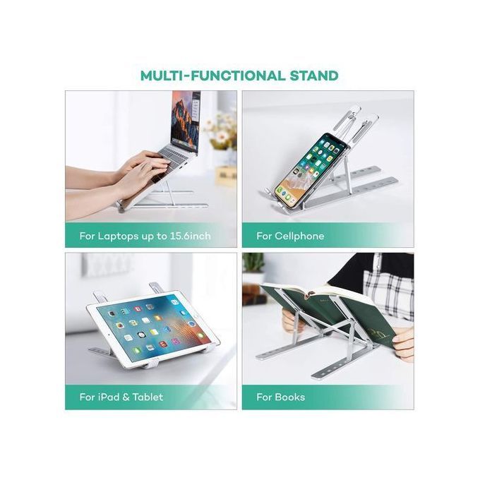 This stand can be flexibly adjusted with 6 modes to meet your different needs and provide more comfortable viewing experienceIt is durable, sturdy and stable with high quality material and anti-slip design. With hollow designing worry about overheating of the laptops after long time working. Compact and portable design is great for both indoor and outdoor use. Besides, it widely supports different kinds of laptops and taFeatures:Multi-Level Height Adjustment.6 modes for height adjustment are offered to you to elevate your computers from 3.9in to 6.3in height,better protecting your eyes and avoiding pain or tiredness of your neck and shoulder.Exquisite Workmanship.Premium ABS and aluminum alloy material ensures its durability and resistance to scratch and corrosion.Double triangle design with non-slip silicone mats keeps your laptops stable and offers stronger bearing capacity. Efficient Heat Dissipation.Hollow-carved design effectively improve airflow,preventing your computers from overheating due to long time working.Lightweight & Portable.Easy to store and carry,perfect for indoor and outdoor use.
