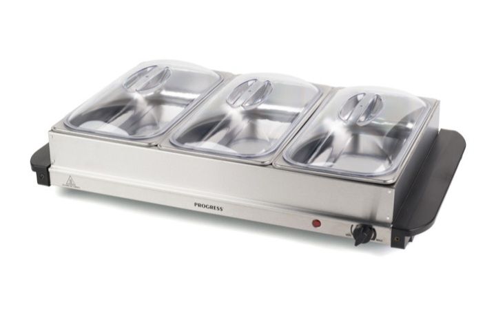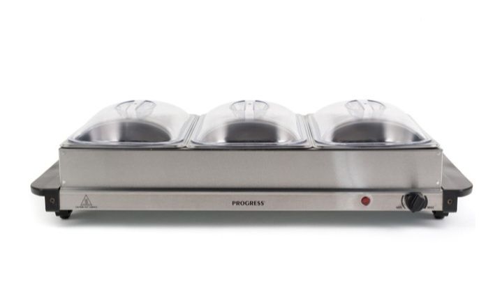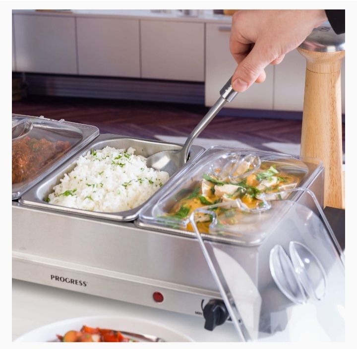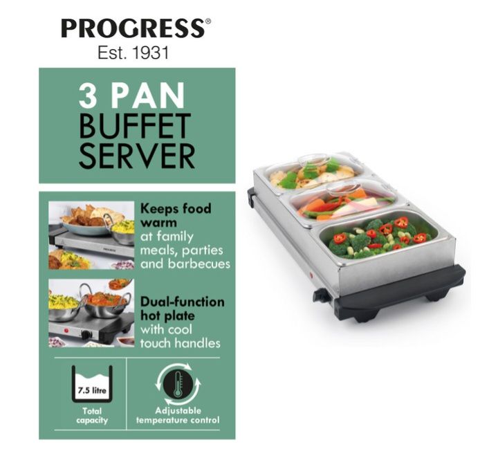 - Great for family meals, dinner parties and catering, the 7.5L Progress Three Pan Buffet Server keeps food warm for up to three hours.