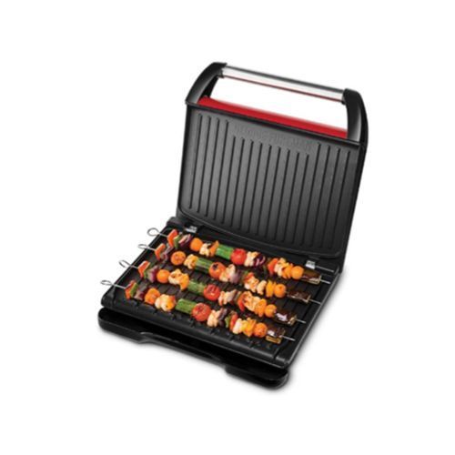 The George Foreman 7 Portion Entertainment Steel Grill is made from premium steel with a sleek red finish. The two non-stick coated grill plates provide simultaneous top and bottom heat for fast grilling. A rear foot can be adjusted for flat or angled cooking whilst the perfect-fit drip tray slides and clips easily into place. A ready to cook light indicates when the grill has reached optimum cooking temperature and a floating hinge easily accommodates larger cuts of meat. When not in use the George Foreman Compact Steel Grill can be stored upright to reduce the amount of space it takes up.