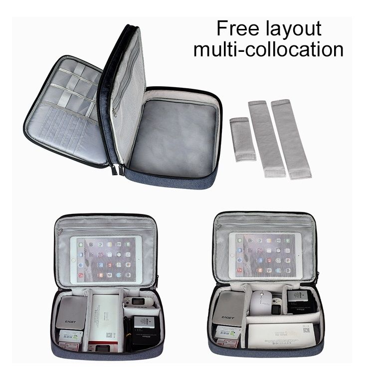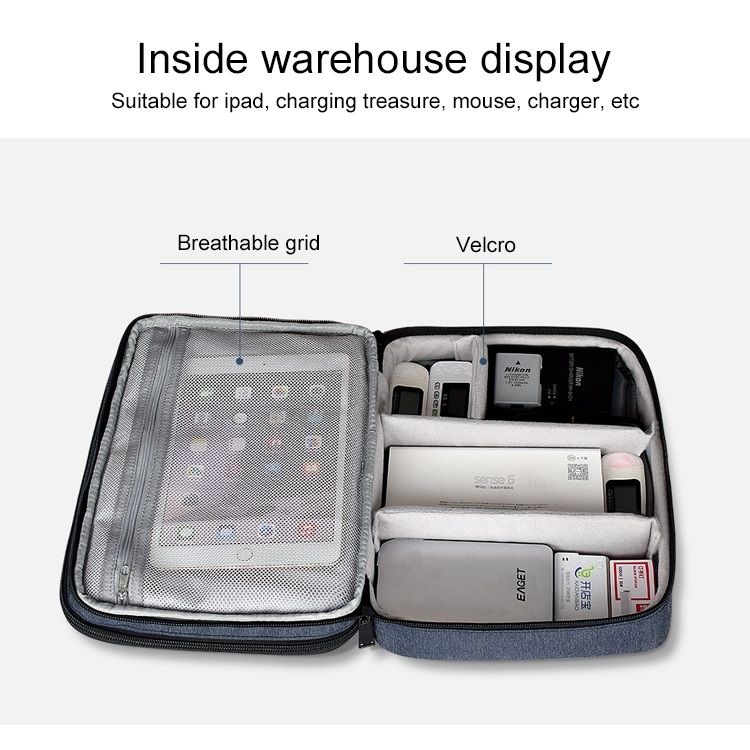2. Front warehouse: tie line grid + zipper grid + card storage, rear warehouse: zipper grid + velcro, can be placed in data lines, headphones, iPad, charging treasure and other large and small objects.