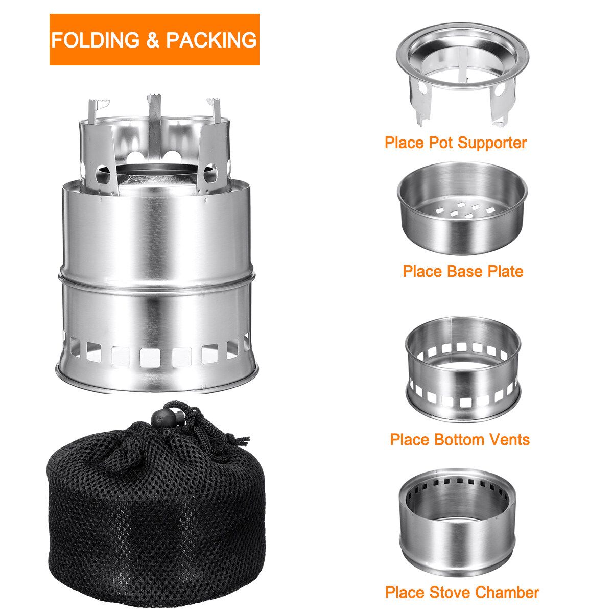 -UNLIMITED FREE FUELS: Use the twigs, leaves, branches, wood as fuel to cook a meal on your hike, no more money spent on gas , no chemical emissions and carbon footprint. The stove includes a tray to hold solid alc0hol fuel.