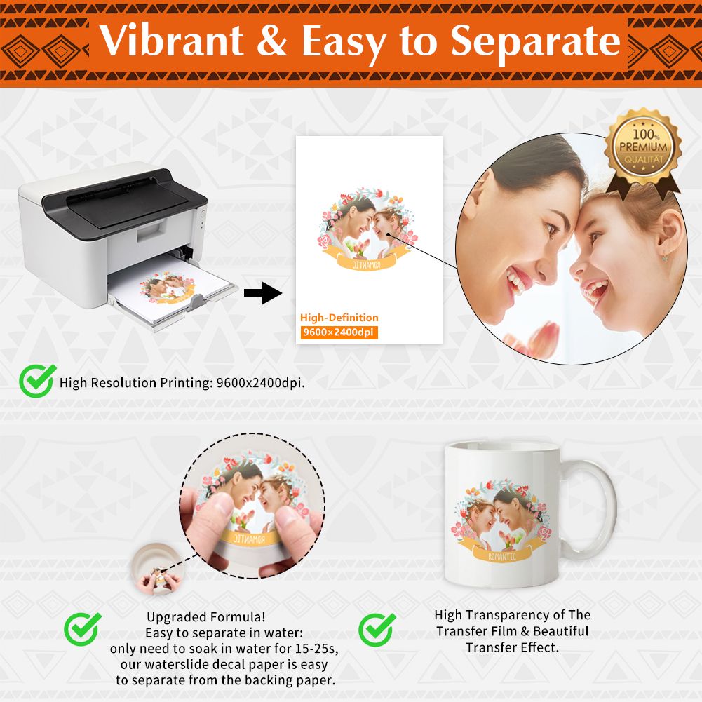 HIGH QUALITY: The decal paper is composed of 2 layers. Bottom layer is custom 120g-backing paper, great for continuous printing without paper jam.