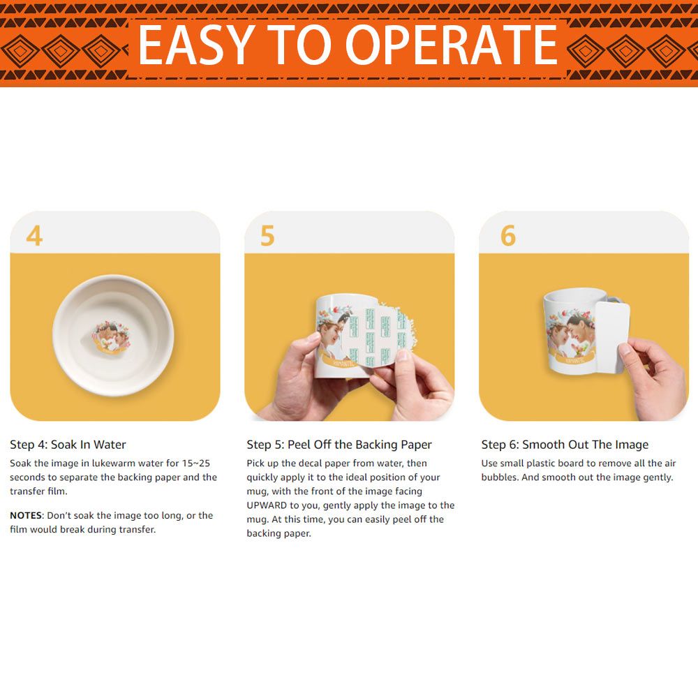 Pick up the decal paper from water, then quickly apply it to the ideal position of your mug, with the front of the image facing UPWARD to you, gently apply the image to the mug. At this time, you can easily peel off the backing paper.