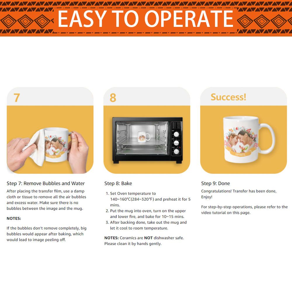2、When transferring the image: Please use damp cloth or tissue to remove air bubbles and excess water completely. Make sure no bubbles between the image and the mug, otherwise big bubbles would appear after baking, which would achieve poor transfer result, the image would peel off.