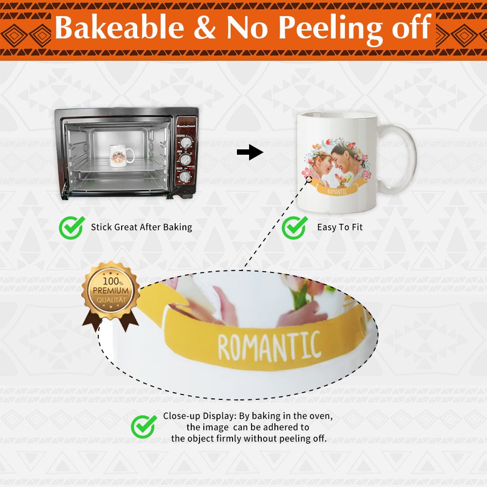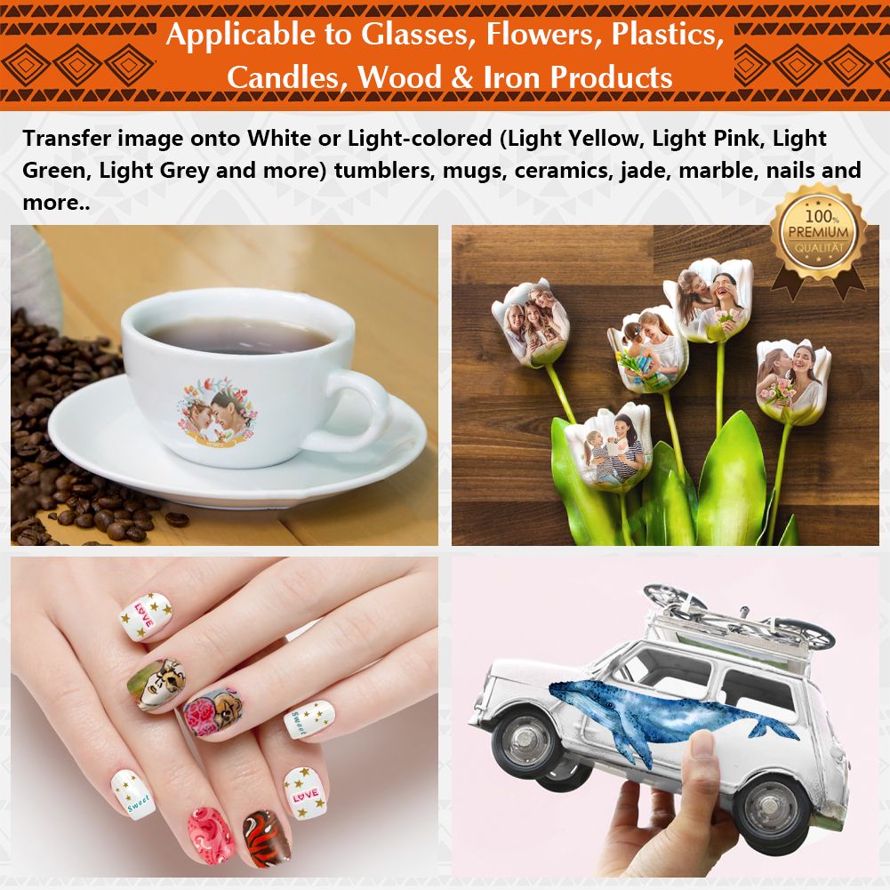 Compatible Materials: mugs Glass, Ceramics (By baking in the oven, the image can be firmly adhered to the object without peeling or falling) Candles, Nail-Art, Flowers and more.