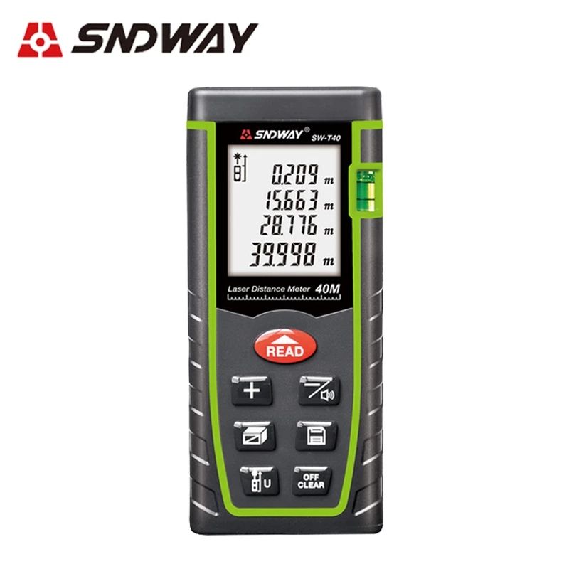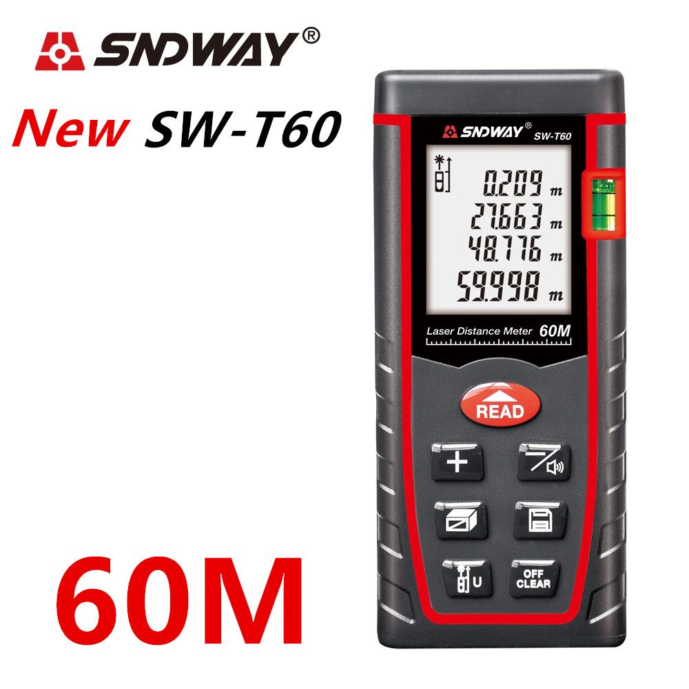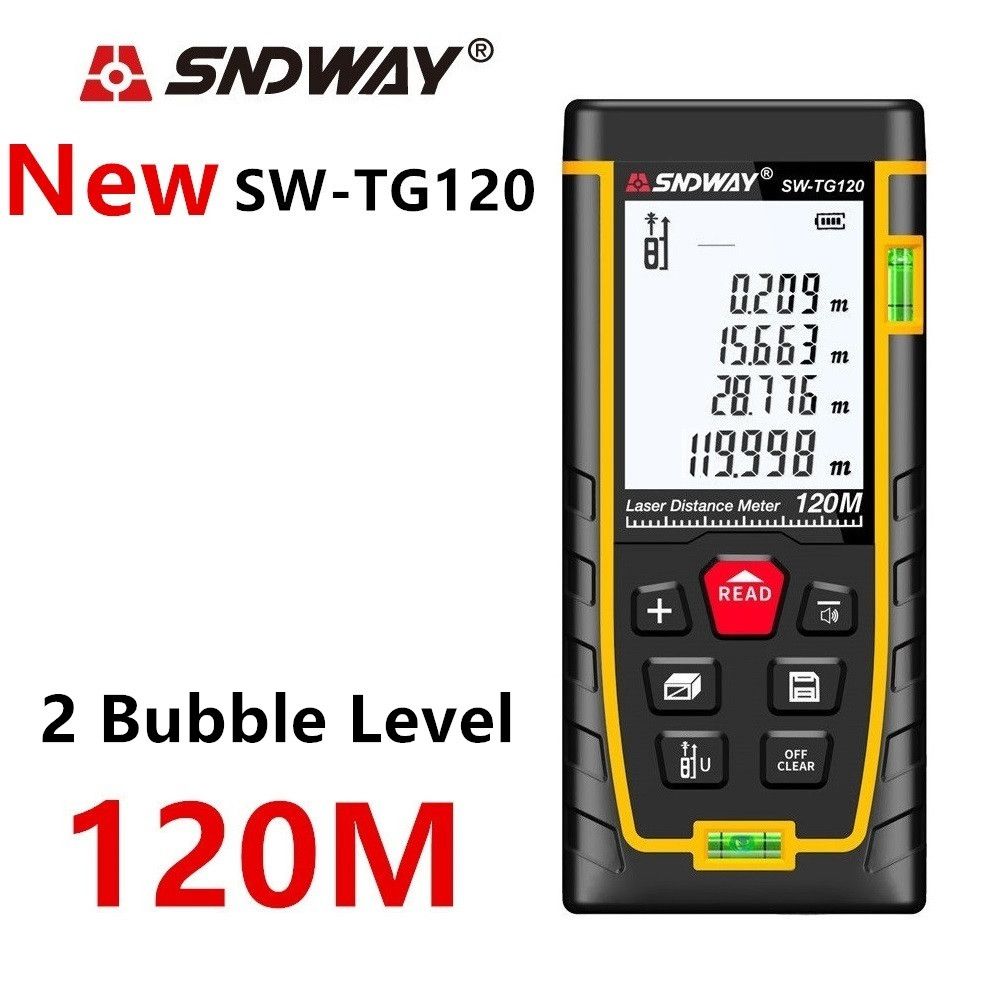SNDWAY New arrive laser distance meter has following features: 1.Measurement unit options:m/ft/in2. 30 units data storage3. High accuracy as 2.0 mm and wide measuring: 40M / 50M / 70M / 100M / 120M4. Set up front / rear benchmark.5. Large 2.0inch LCD with backlight.6. Double Air BubbleSpecifications: Measuring range: 0.05 to 80m/60M/40M (0.16 to 262ft/197ft/131ft)Acurracy: ±2mm (0.079inch)Laser class: Class IILaser maximum output: 1MwDust & Splash proof: IP 54Laser Auto off: 20SPower Auto off: 150SOperation temperature: 0~40C (32~104F)Storage temperature: -20~60C (14~140F)Power supply: 2 x 1.5V AAA battery (Please note that we have to take away the batteries due to the policy of the shipping companyDimension: 112*50*25mm (4.41 x 1.97 x 0.99inch)Weight: approx. 250 g