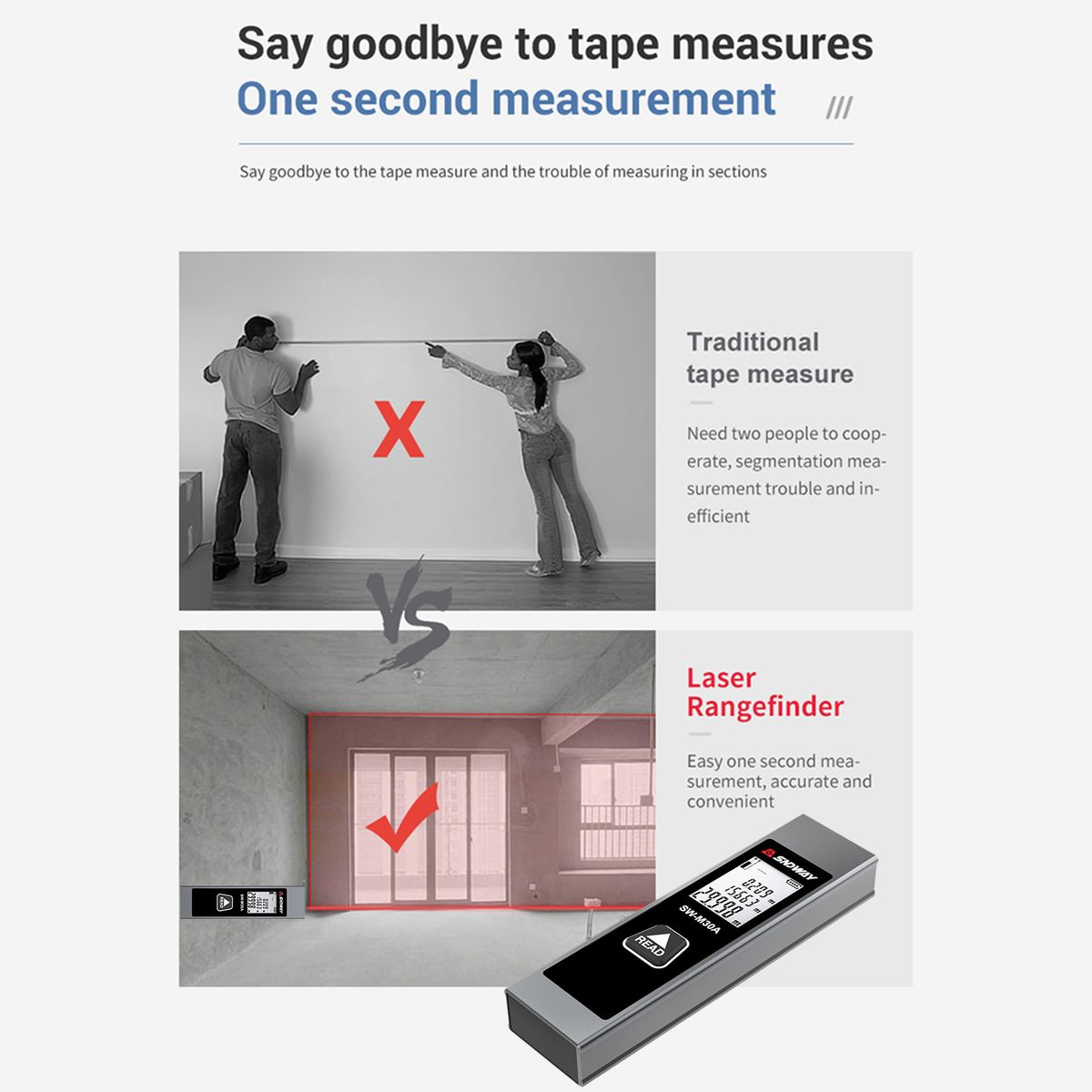 Features:Millimeter Precision - equipped with high-speed algorithm chip and upgraded lens, this meter delivers stable and precise measurement with accuracy of ±2mm.