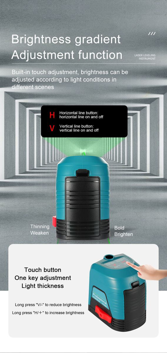 A. Press V for a long time to thin the light, and the bright spot gradually weakens, which is suitable for close work. For example, the wall tiles and floor tiles are equal to the light, and the weak light can be used for close construction. The advantage is that the eyes will not have irritating pain, but also save electricity and prolong the service life of the laser head;