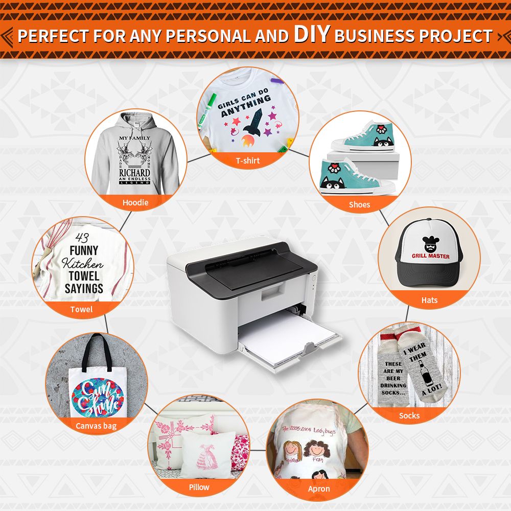 For Laser printers, scissors & cutting machine. The printing quality is quite vivid and vibrant. Easy to transfer and use. Machine washable with cold water in Full Cycle mode. No tumble dry. No peeling, no cracking after 30 washes.