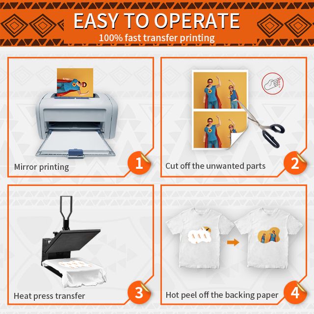 Easy to use: [1] Print & Cut out the image. [2] Peel & Place the printed image facing UPWARD onto fabric and cover the image with Teflon Paper. [3] Transfer Image with Iron or Heat Press. [4] Remove the Teflon paper. Transfer has been done! Step-by-step instructions are on the back of cover paper in the pack.