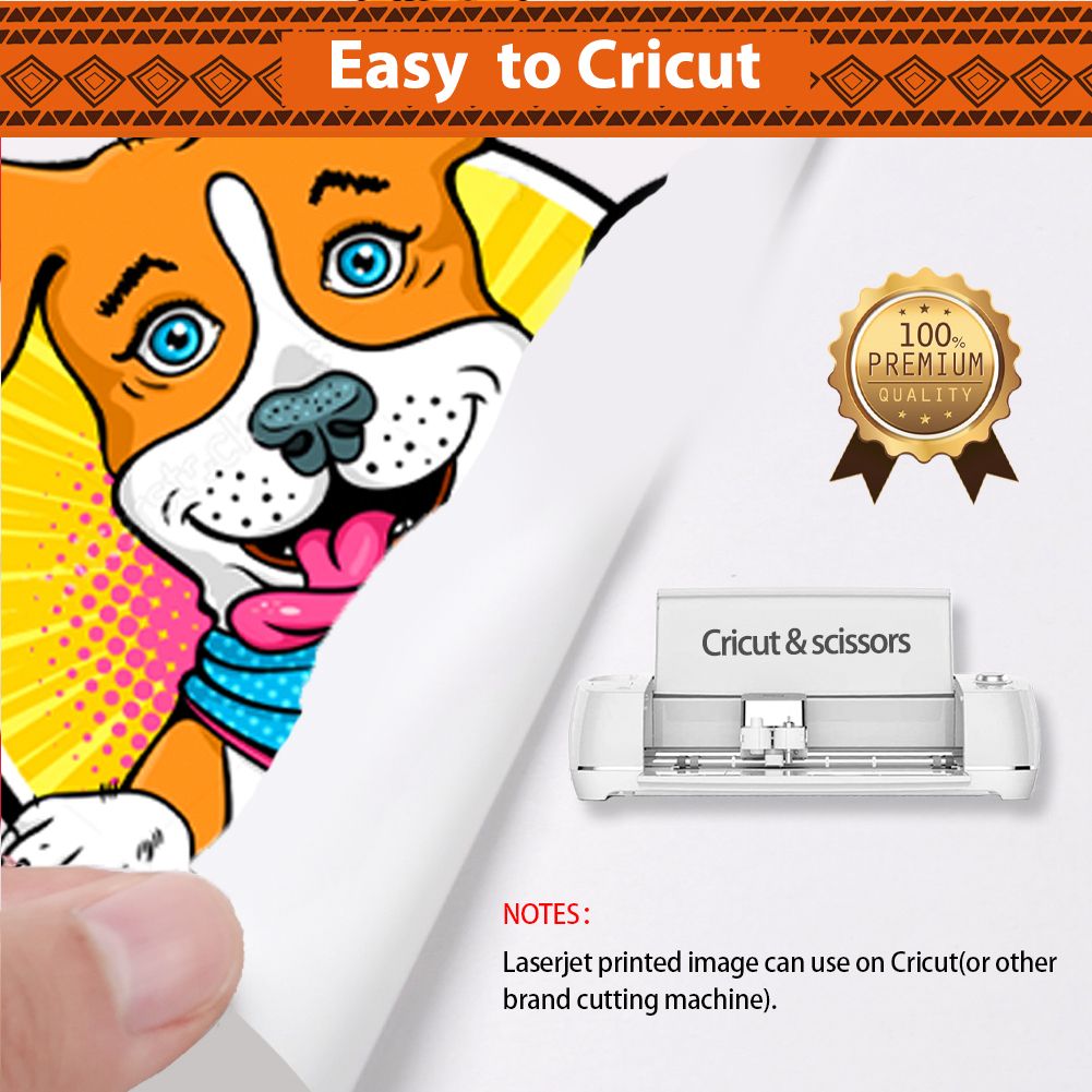 Compatible with LASER printers, scissors & cutting machine. The printing quality is quite vivid and vibrant. Easy to transfer and use. Machine washable with cold water in Full Cycle mode. No tumble dry. No peeling, no cracking after 30 washes.