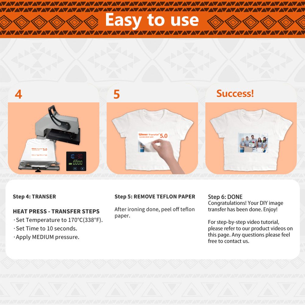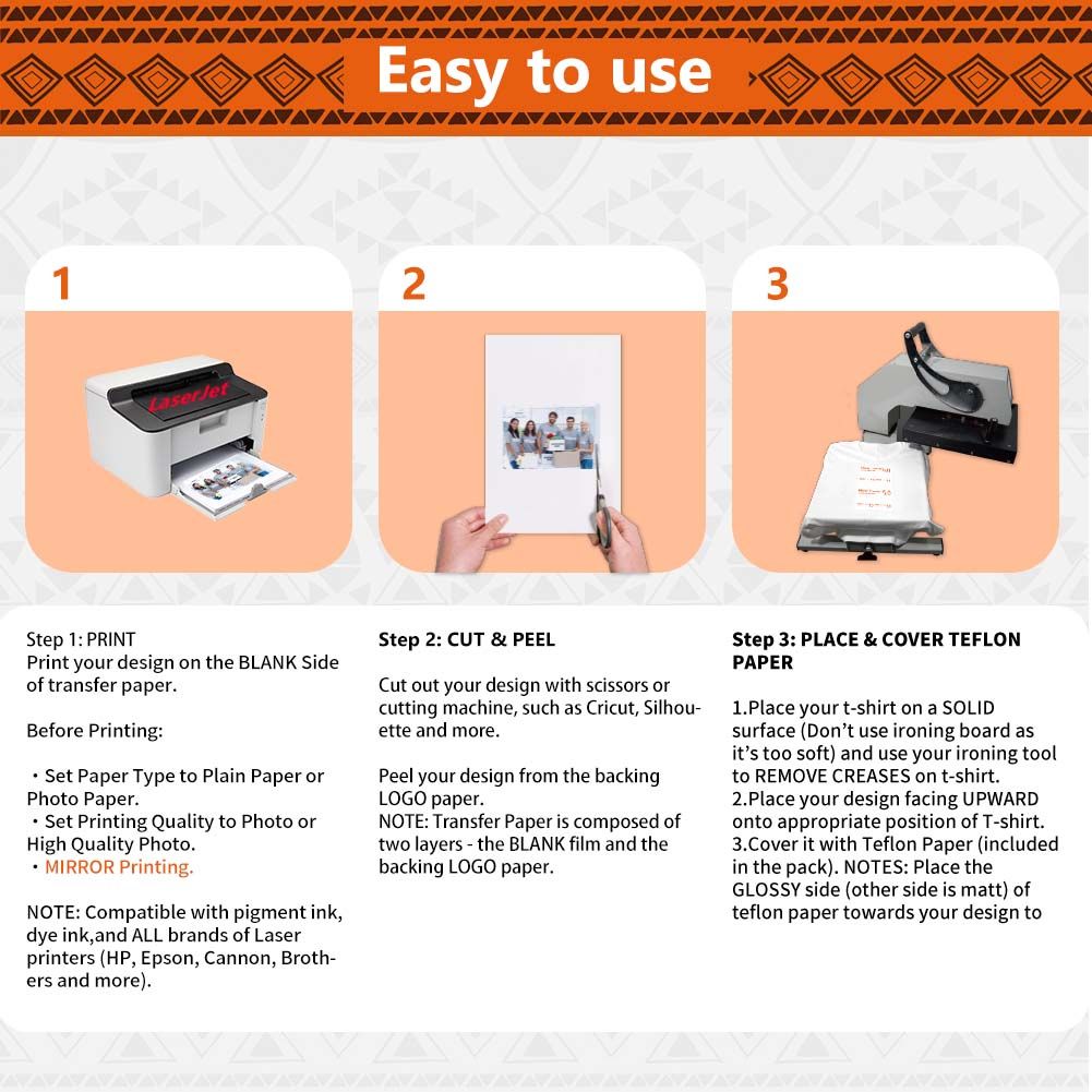EASY TO USE: [1] Print & Cut out the image. [2] Peel & Place the printed image facing UPWARD onto fabric and cover the image with Teflon Paper. [3] Transfer Image with Iron or Heat Press. [4] Remove the teflon paper. Transfer has been done! Step-by-step instructions are on the back of cover paper in the pack.