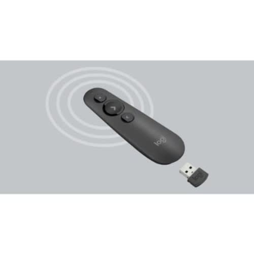Logitech Wireless Presenter R500 Mid Greyr500 laser presentation remotepresent effortlesslydeliver impactful presentations with the r500 laser presentation remote. move freely and navigate slides from up to 20 meters away & ndash; and point out precise areas of focus with the red laser pointer. the r500 is optimized to work with windows & reg;, macos and leading presentation softwaresimply presentthe r500 is a simple, reliable, and hassle-free presentation remote & ndash; so you can focus on crushing your delivery.DESIGNED FOR A SECURE GRIP