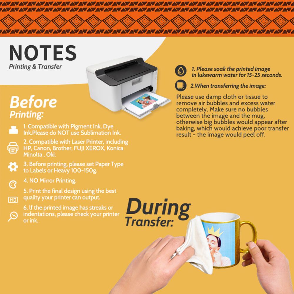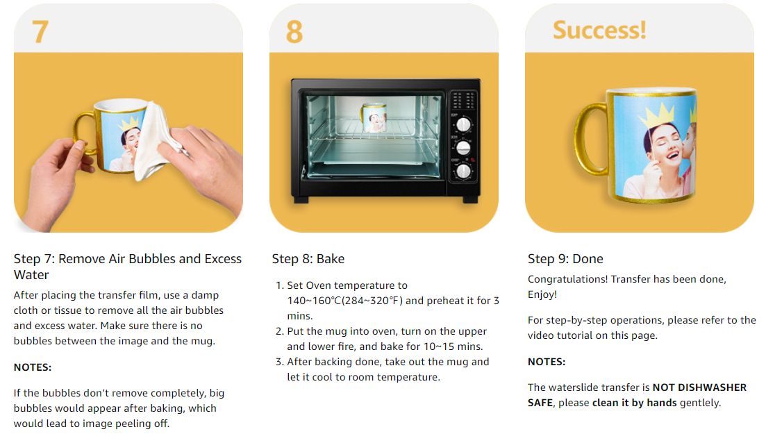2、When transferring the image: Please use damp cloth or tissue to remove air bubbles and excess water completely. Make sure no bubbles between the image and the mug, otherwise big bubbles would appear after baking, which would achieve poor transfer result, the image would peel off.