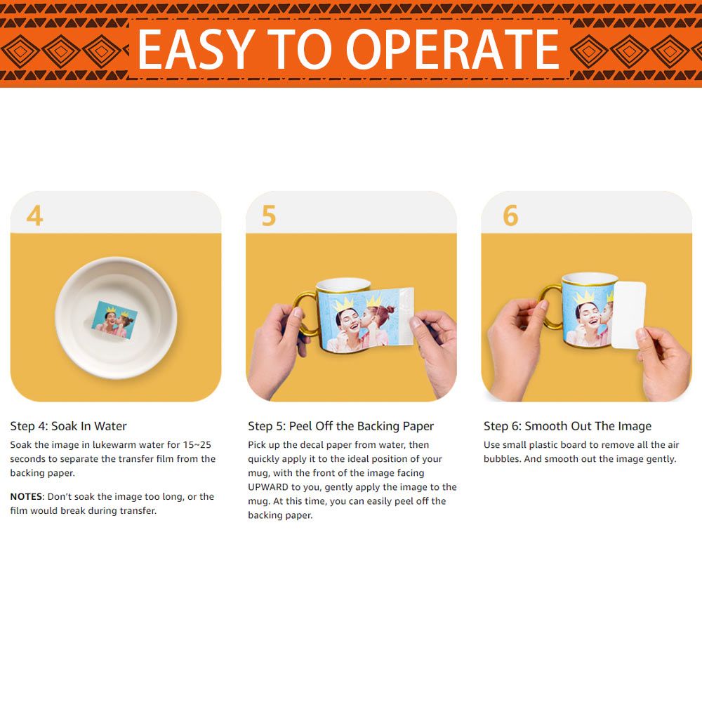 Pick up the decal paper from water, then quickly apply it to the ideal position of your mug, with the front of the image facing UPWARD to you, gently apply the image to the mug. At this time, you can easily peel off the backing paper.