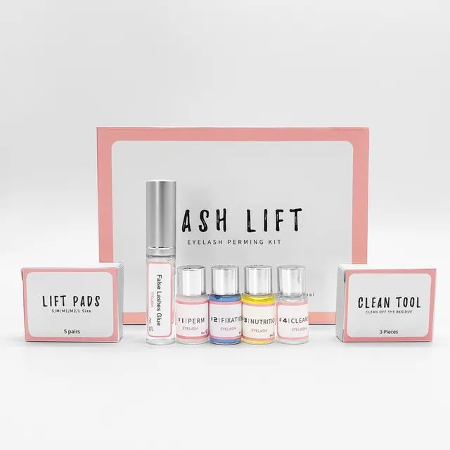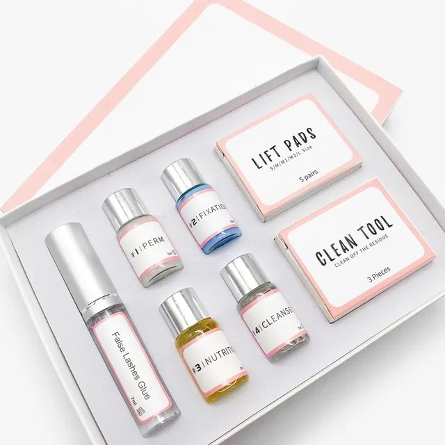 The kit includes perm agents, fixation, nutrition, lashes glue, cleaning tool and cleaning pads.
