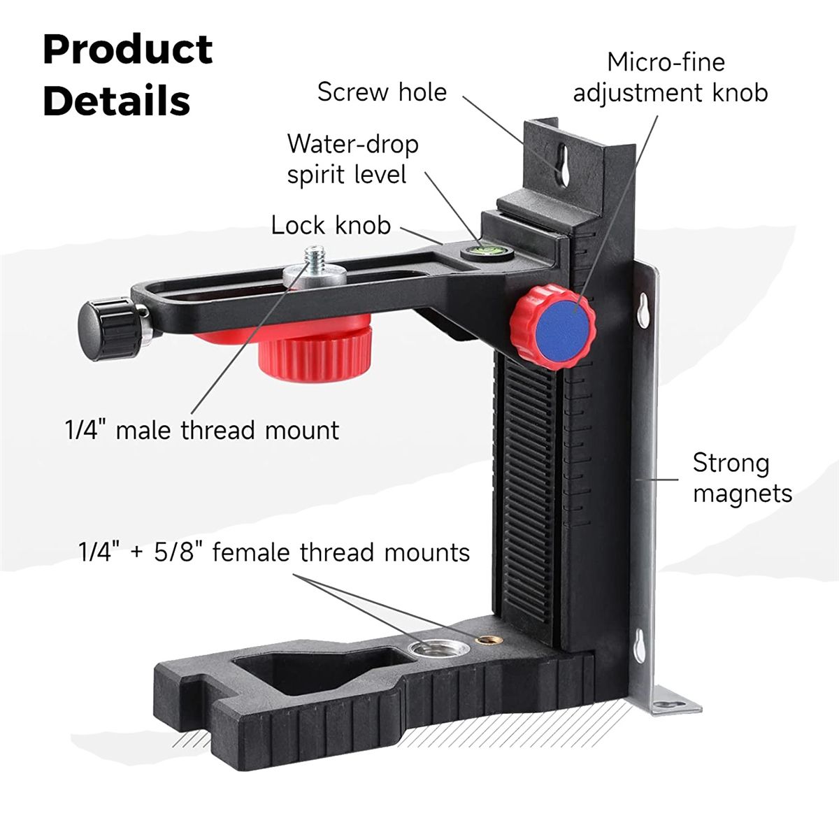 Wide compatibility The bracket is designed with 14inch external thread installed on the laser-level and 14inch and 58inch internal thread installed on the standard tripod or laser-rod It is suitable for different types of laser-level and is suitable for any workp