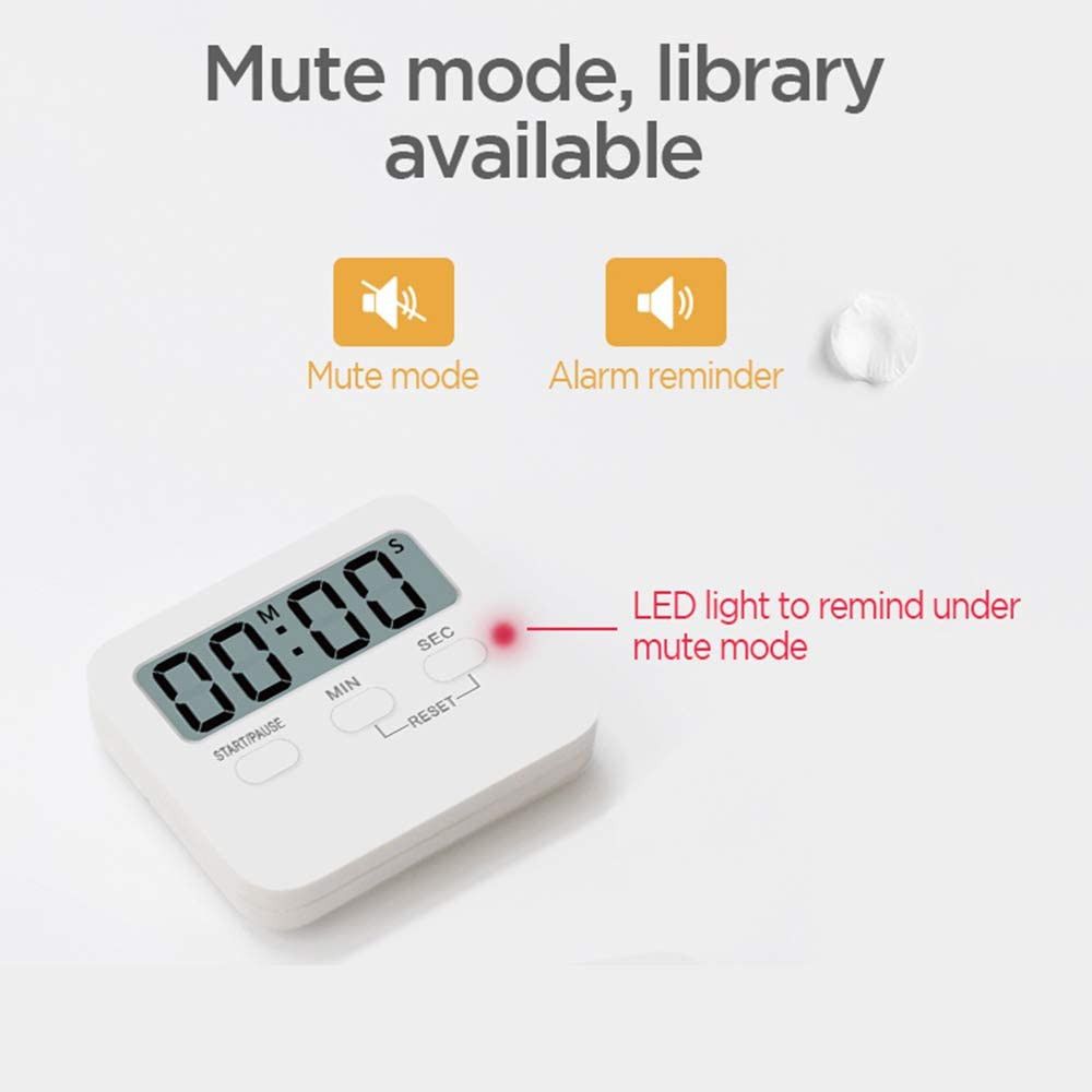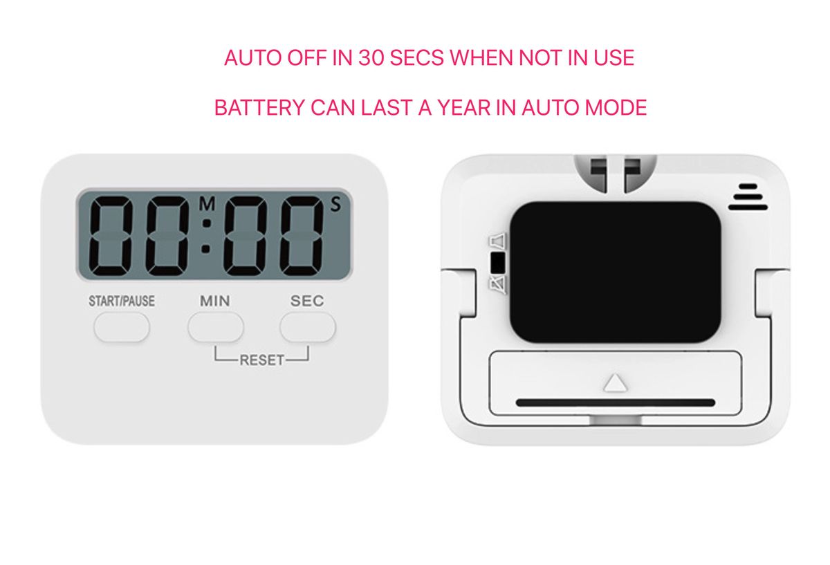STRONG SOUNDING ALARM - Comes with ON/OFF Switch. Powered by 1*AAA battery ( Not included ). Loud & clear sound but not deafening. The alarm sound can be heard from another room. LARGE LCD SCREEN AND BIG DIGITS - With bigger and clearer LCD screen, this kitchen timer can simple to read the time and bold numbers across the room. Maximum time is 99 minutes, 59 seconds. Push and hold button over 3 seconds then the time will fast forward, adjust to zero by just pressing the "MIN" and "SEC" button at the same time COUNTS UP AND DOWN - As well as a countdown timer and minute timer this can also act as a stopwatch counting up from zero. Perfect timer for homework, exercise, gym workout, cooking (egg timer), sports, games and classroom timer activities. MAGNETIC BACK, RETRACTABLE STAND AND HOOK FOR HANGING - You have 3 different choices for placement of the Kitchen Timer. Either stick it to the fridge door with its large magnet, or use the pull out stand for table-top use, and finally you can run a piece of string through the hook and hang it on a wall hook or around your neck.