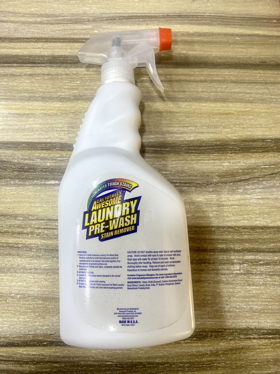 Directions:1. Spray LA's Totally Awesome Laundry Pre-Wash Stain Remover undiluted to small inconspicuous portion of washable fabric to be cleaned. Rub cloth together, if no discoloration of garment continue use 2. Spray product directly onto fabric, completely saturate the soiled area3. Let stand for a minute 4. Launder the fabric using regular detergent in the normal wash cycle 5. For best results, rub LA's Totally Awesome Pre-Wash Laundry Stain Remover directly onto Stain before washing garment.