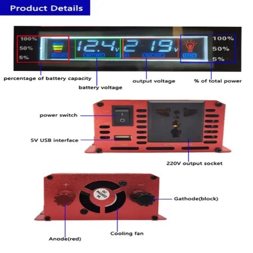 Input voltage Output voltage Rated power 1000w with separate 10A Durable metallhousing provides advanced rotectionn from drops and bumps . Integrated cooling fan helps reduce heat and prevents shortages. [Protections].Overload protection. Over-temperature protection. Input over voltage protection.Protections To ensure the safety of the power inverter safe protections are designed ,including overload protection, over voltage protection, low voltage protection, high temperature protection and output short circuit protection.Efficiency. Durable metal housing provides advanced protection from drops and bumps. Integrated cooling fan helps reduce heat and prevents shortages. [Protections].Overload protection. Input over voltage protection. Over-temperature protection.High conversion efficiency, smart soft start function.Multiple safe protections.Input and output are completely independent.Smart light and portable, designed for home use. Universal socket, suitable for all kinds of plugs. Applicable for resistive AC loads.High-precision voltage stability technology.