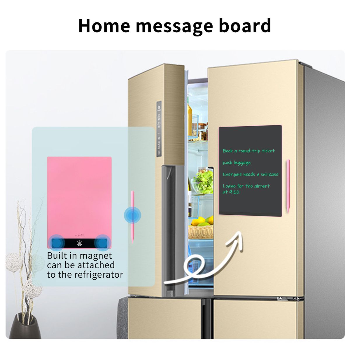Magnetic pen: The handwriting board has a built-in strong magnet on the front.The magnetic design allows the stylus to be attached to the handwriting board,which is convenient for writing and avoids the loss of the stylus.And the back of the writing board can be attached to any surface with iron,making storage more convenient.