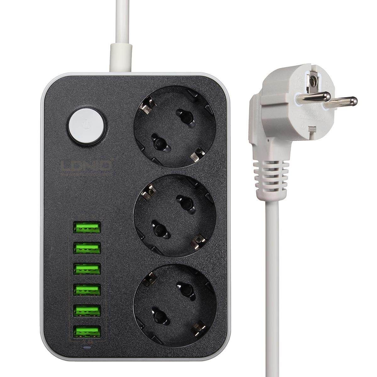 Characteristics: * 3 AC outlet European standard and meet your daily needs. * 5.24ft / 1.6m cord provide you with a longer extension plug. * 6 USB ports can be charged at the same time, such as cell phone, tablet, and so on. General Specifications Brand LDNIO Model SE3631 USB port 6 USB port Plug the EU Plug Dimensions 138 * 90 * 43mm Total 17W Rated 2500W 250V 10A * 5V 3.4A () AC100-250V Voltage Rating Length 5.24ft / 1.6m Package Included: 1 X EU Socket Charger