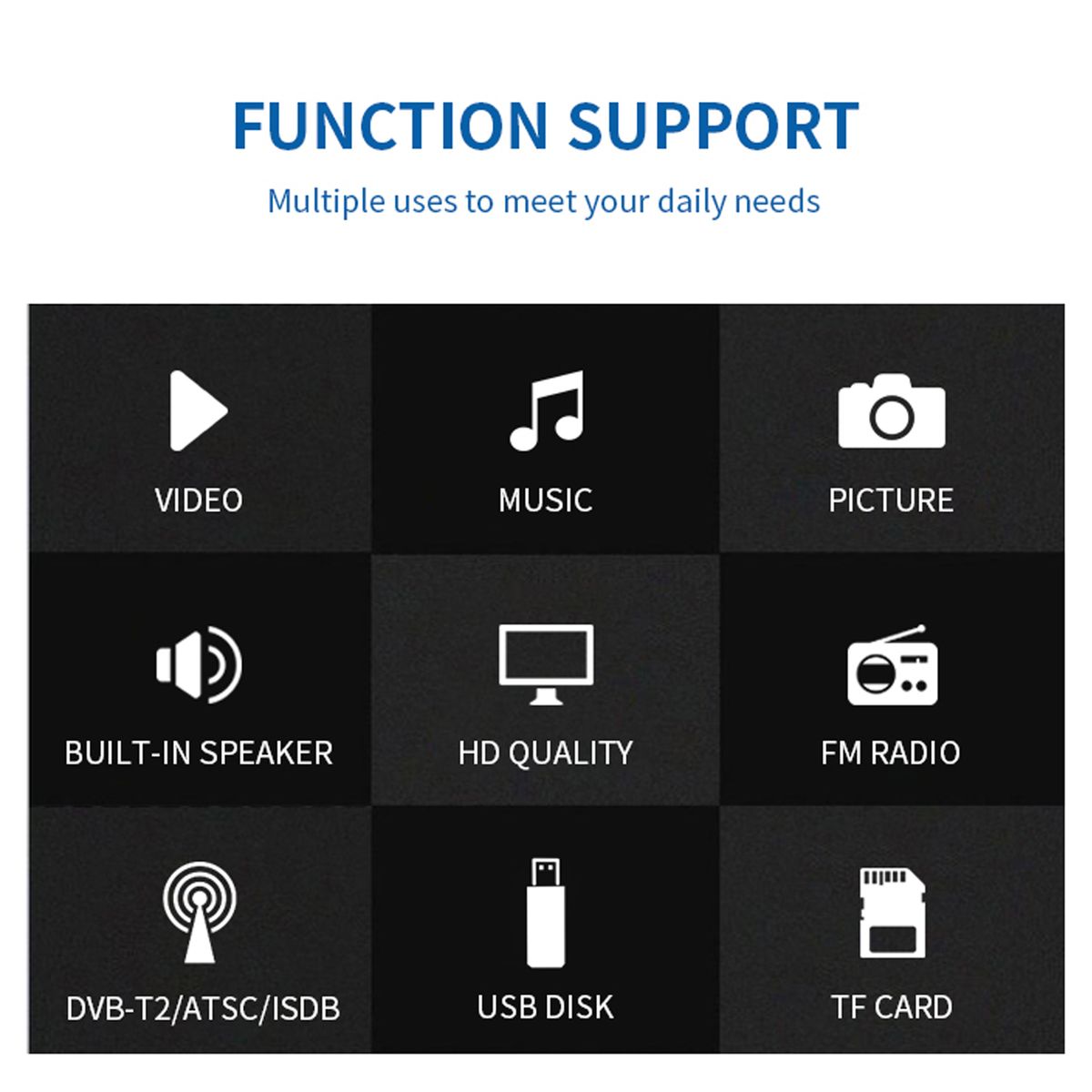 Supports FM radio, TF card reading, U disk reading, 3 playback modes.