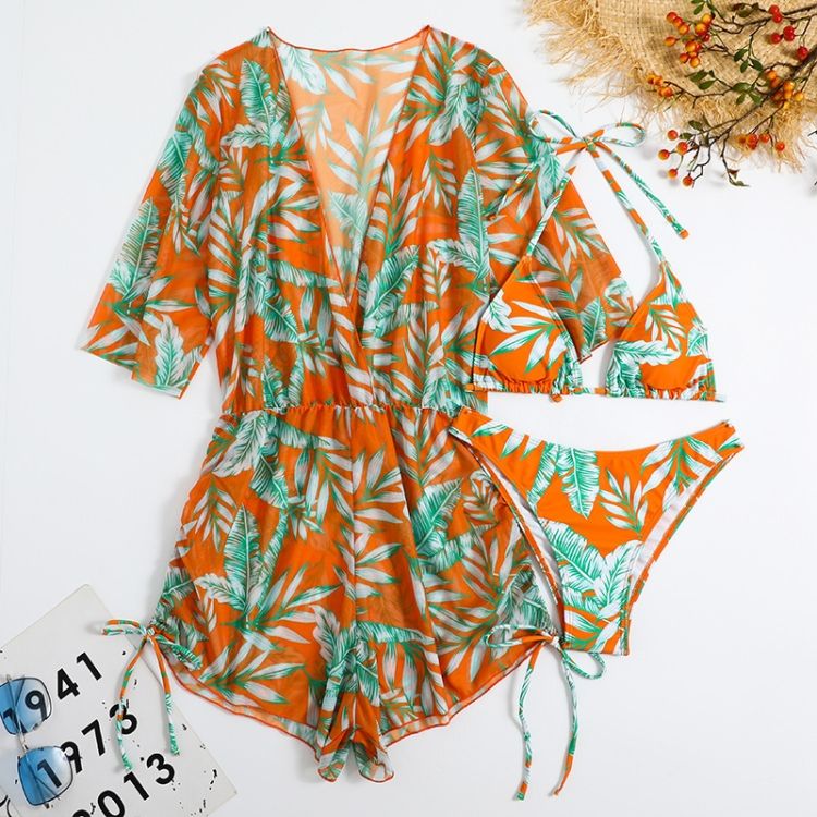 Leaf-print Three-Piece Long-sleeved Swimsuit