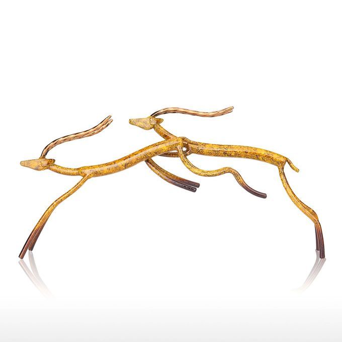 This is a dynamic and elegant antelope ornament, two antelopes are running, jumping, chasing each other. The modeling is very dynamic. Special skin texture paint and exquisite painting process make the color vivid and beautiful. Suitable for living room, bar, study, dining room and other interior space decoration.