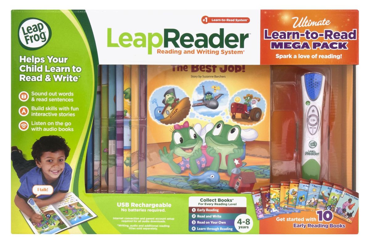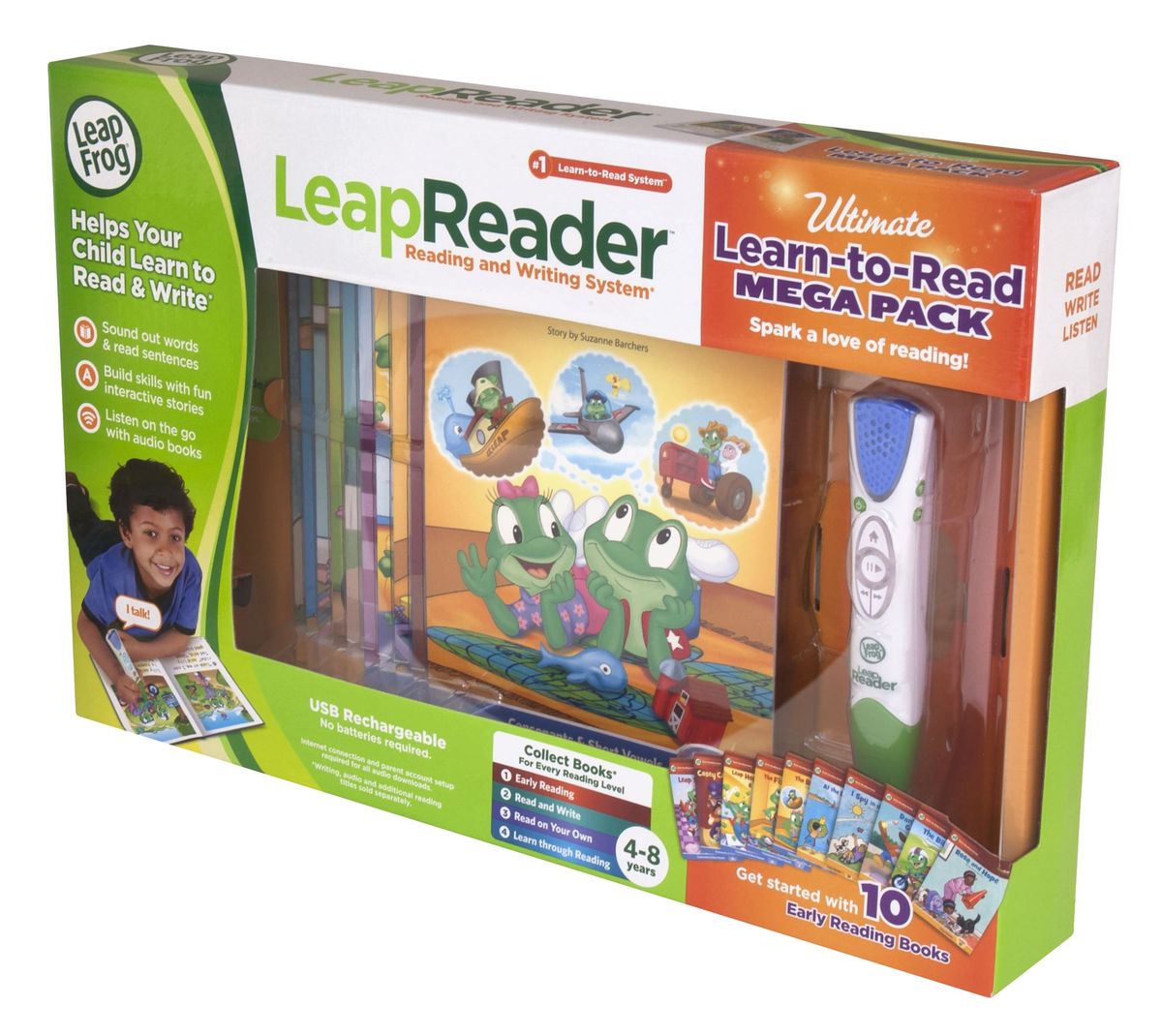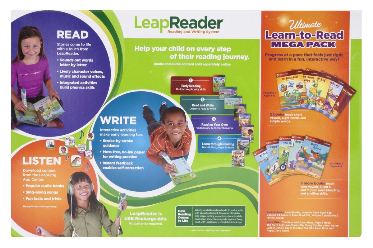 Practice reading by exploring interesting stories with the LeapReader Learn-to-Read 10-Book Bundle. Touch the interactive pages using the included LeapReader system to sound out letters and words or follow along with the stories are theyre read out loud. Each book in this 10-book set includes lively character voices that spark interest and activities that help build reading confidence by introducing vowel sounds, sight words, word blending, spelling skills and more. Build writing skills with stroke-by-stroke guidance and instant feedback using mess-free, no-ink paper. Continue the reading journey with additional LeapReader books that advance through four reading levels (sold separately). Intended for ages 4-8 years. Rechargeable lithium-ion battery included.